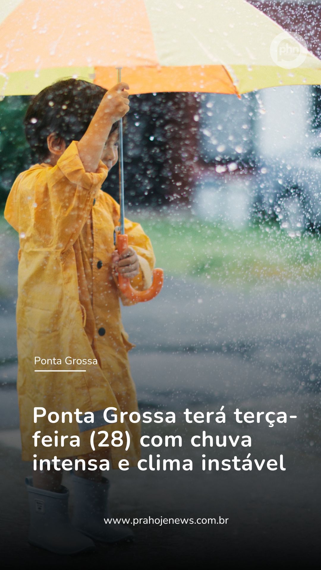 A previsão do tempo para esta terça-feira (28) indica um dia de chuvas fortes e alta umidade em Ponta Grossa, com temperaturas mais amenas e visibilidade prejudicada por conta do tempo instável que deve permanecer ao longo do dia.
